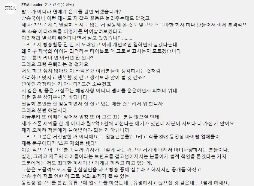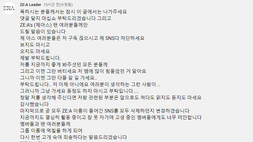 28일 문준영의 자신의 유튜브 채널 'ZE:A Leader' 커뮤니티에 "욕하시는 분들께서는 잠시 이 글에서 나가주세요"라는 구절로 시작하는 글을 게재했습니다.
