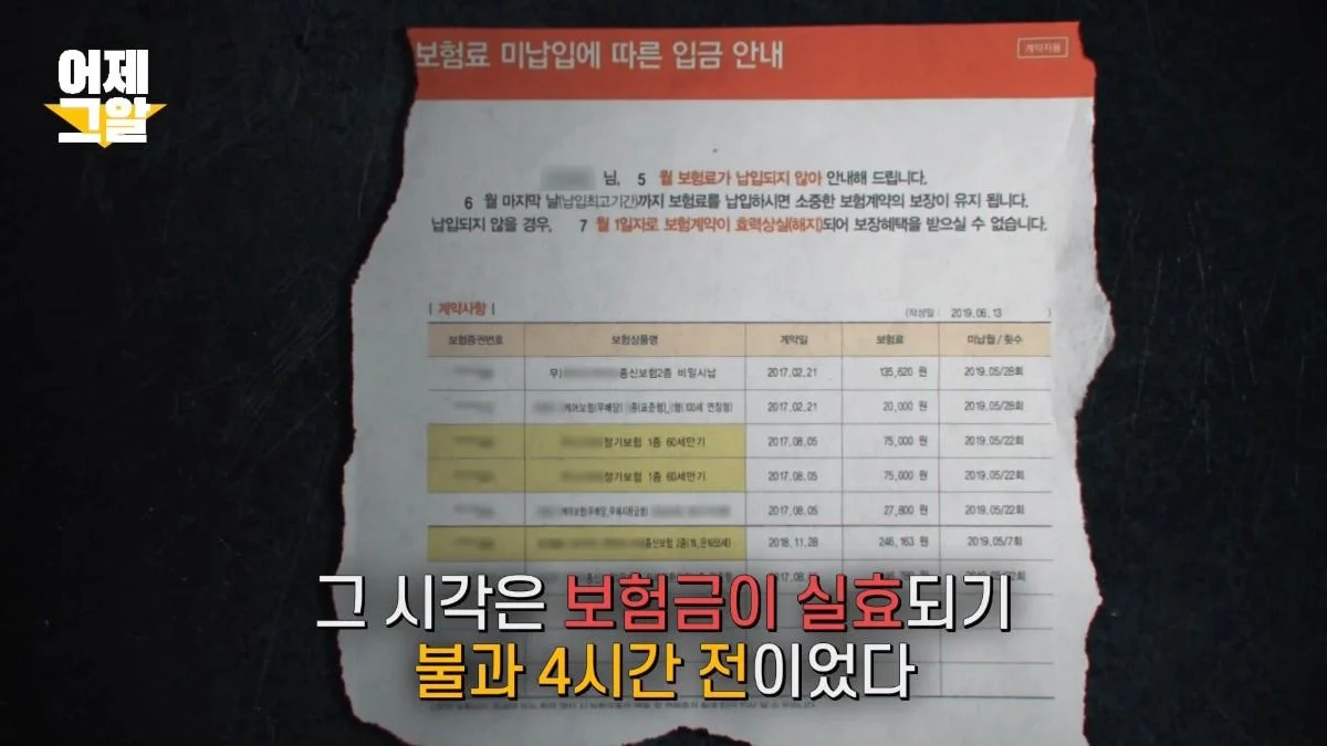 그리고 윤 씨가 피보험자였던 보험은 여러 차례 실효 위기였던 것으로 드러났습니다. 그러나 실효 직전 보험금을 납입하며 겨우 보험을 이어가고 있었던 것. 또한 윤 씨가 사망한 것은 보험 실효 4시간 전이었습니다.