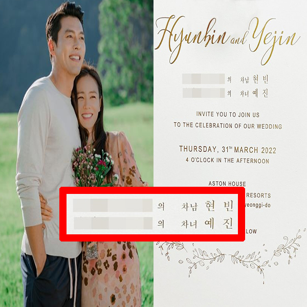 청첩장은 순백의 바탕에 고급스러운 골드 톤으로 현빈과 손예진의 이름이 영어로 새겨져 있습니다. 차남인 현빈과 차녀인 예진의 결혼식을 알리는 메시지가 간결하게 적혀있는데요. 철통보안 결혼식인 만큼 청첩장 지참은 필수라고 전해졌습니다.