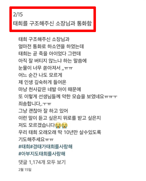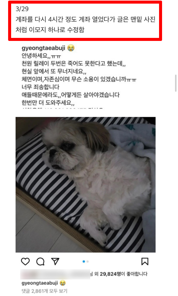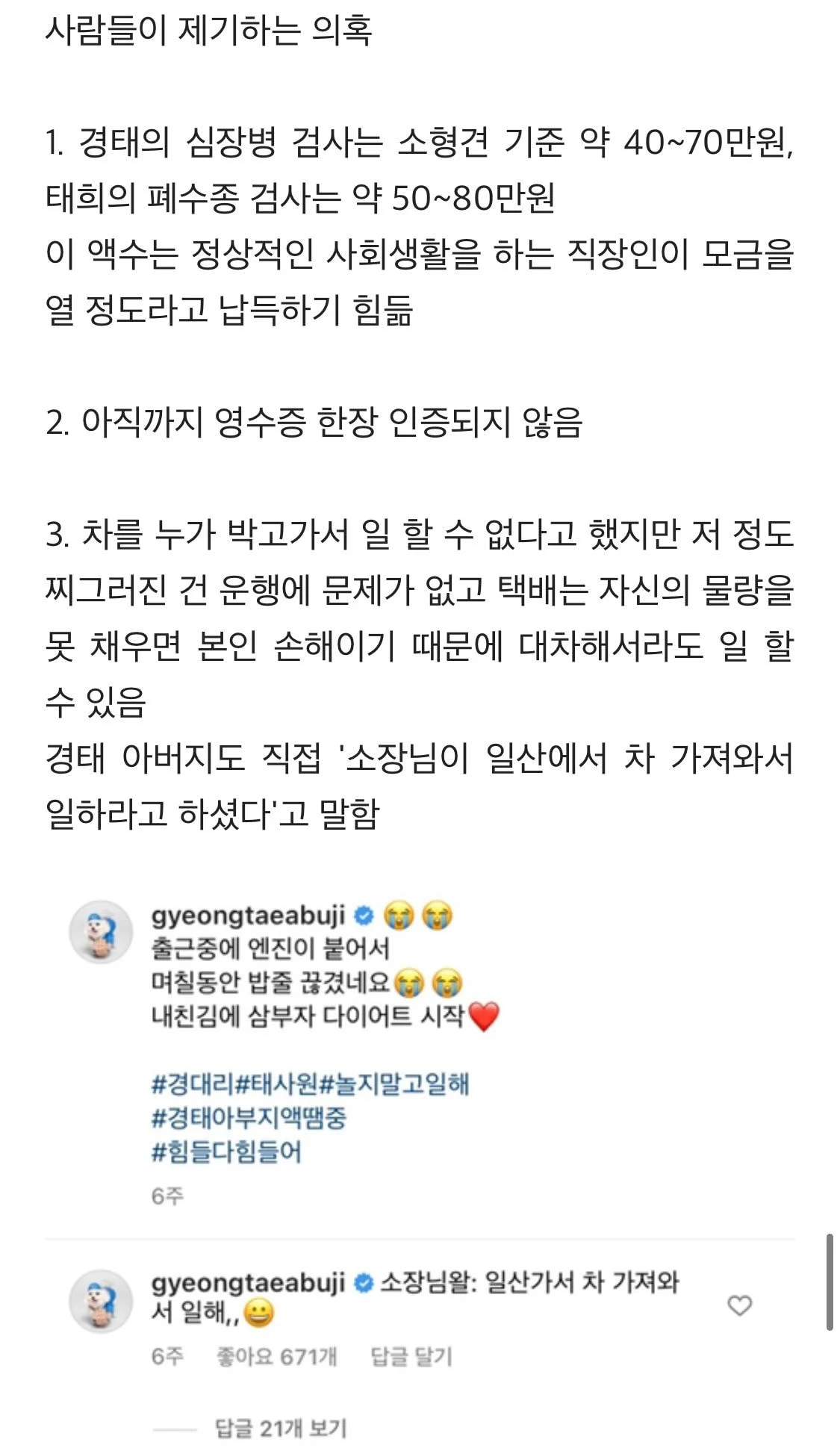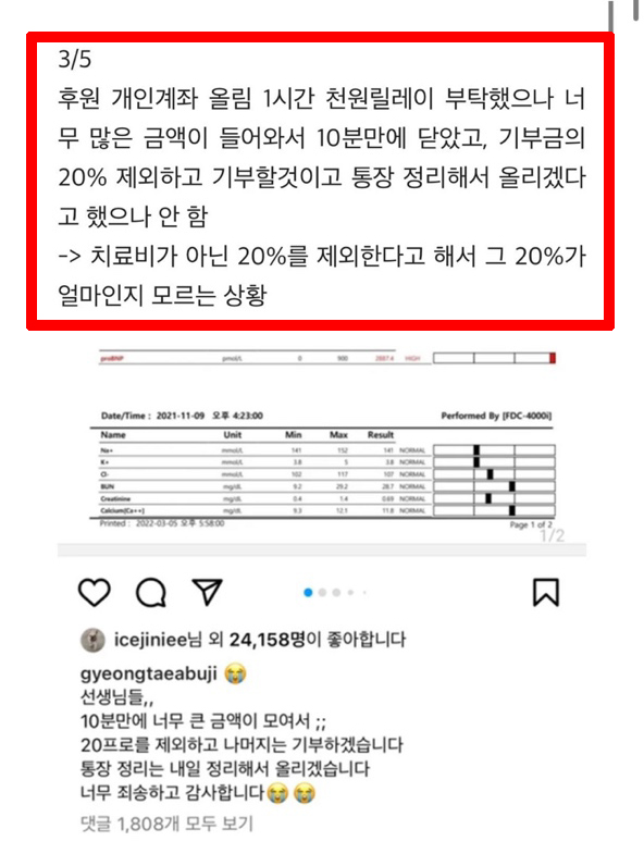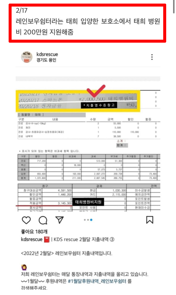 글쓴이는 "지난달 17일 태희를 입양한 보호소에서 이미 태희 병원비를 200만 원을 지원해줬다"며 "이후 지난 5일, 경태아부지는 인스타그램을 통해 개인 계좌를 올리며 후원을 요청했다. 너무 많은 금액이 들어와서 10분 만에 계좌를 닫았고, 기부금의 20%를 제외하고 기부할 것이고 통장을 정리해 올리겠다고 했으나 하지 않았다"고 했습니다.