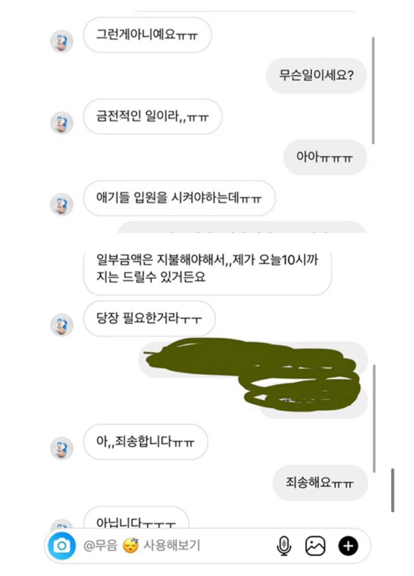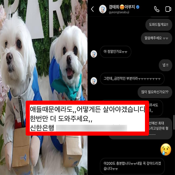 공개된 사진속에는 경태, 태희의 보호자가 다수의 누리꾼들에게 "당장 필요한 건 480인데 일부만 빌려주셔도 된다. 내일 갚아드릴 수 있다", "당장 필요한 거다 일부 금액을 지불해야 한다", "저 좀 도와주시면 안 될까요" 등 여러 번 후원을 요구한 내용이 담겼습니다.