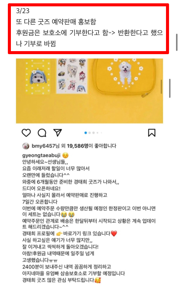 이어 "지난 7일에는 천만원이 넘는 금액은 돌려줘야 한다며 순차적으로 반환하겠다고 하고, 14일에는 이모티콘 홍보글을, 23일에는 굿즈를 홍보하며 전에 받은 후원금은 보호소에 기부하겠다고 밝혔다"며 "27일에는 경태가 심장병 진단을 받았다고 올리며 굿즈 수익금은 경태희 치료비로 쓰겠다고 전했다"라고 설명했습니다.