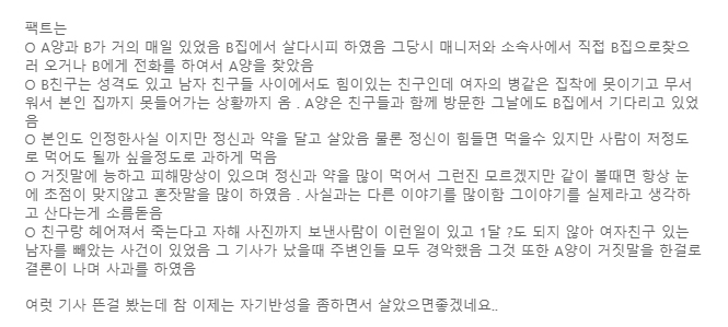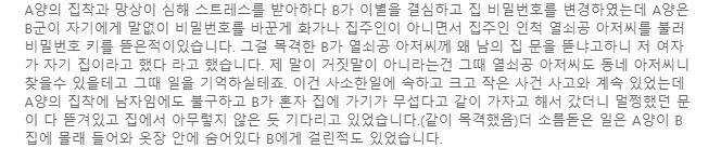이어 "내 친구가 A와 멀어진 이유는 A의 집착 때문이었다. A의 집착과 망상이 심해 스트레스를 받던 B는 이별을 결심하고 집 비밀번호를 바꿨는데 A는 열쇠공 아저씨를 불러 번호 키를 뜯은 적도 있다"며 "B는 남자임에도 불구하고 혼자 집에 들어가기 무섭다고 같이 가자고 한 적도 있다. A는 아무렇지 않게 집에서 기다리고 있더라. 심지어 옷장에 숨어 있다가 발견된 적도 있다"라고 폭로했습니다.