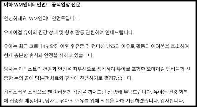 오마이걸 소속사 WM엔터테인먼트는 5일 "유아가 지난 코로나19 확진 이후 후유증 및 컨디션 난조의 이유로 활동의 어려움을 겪고 있다"고 밝혔습니다.