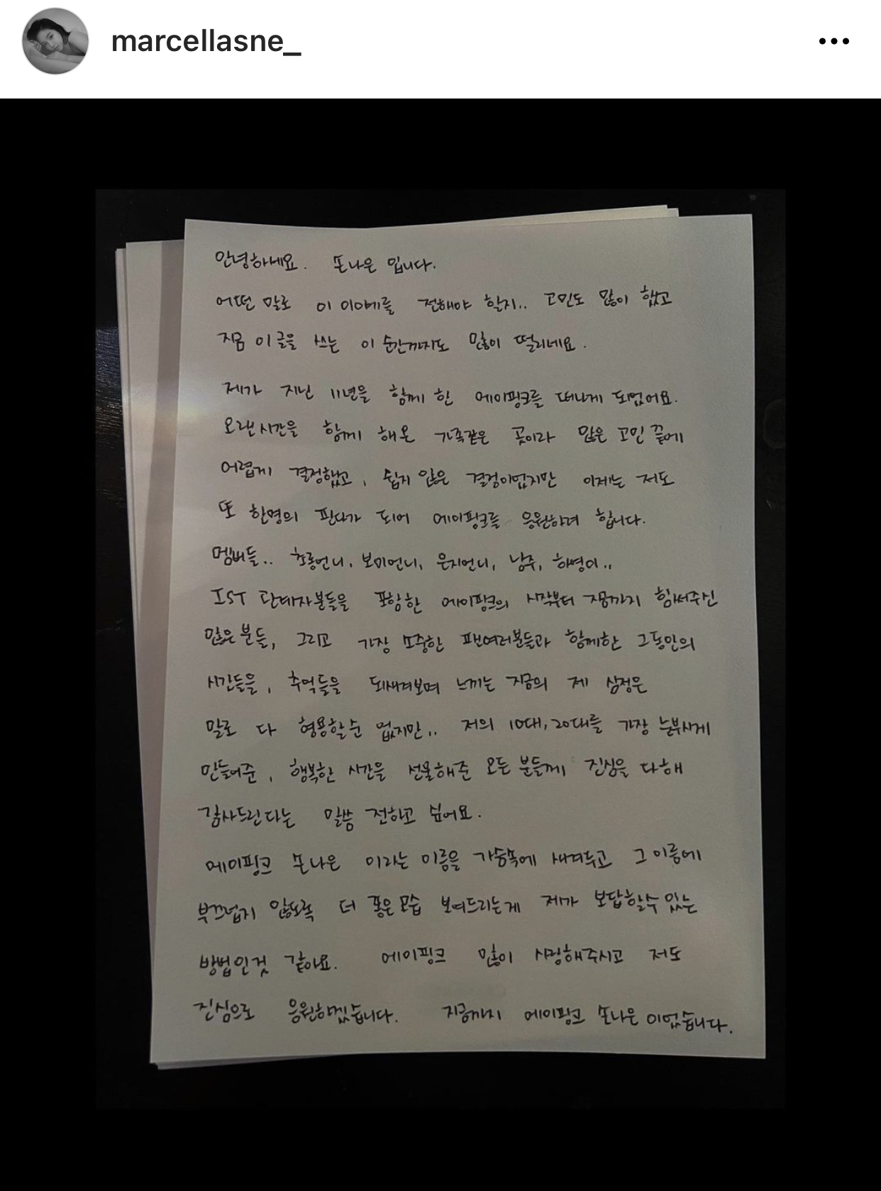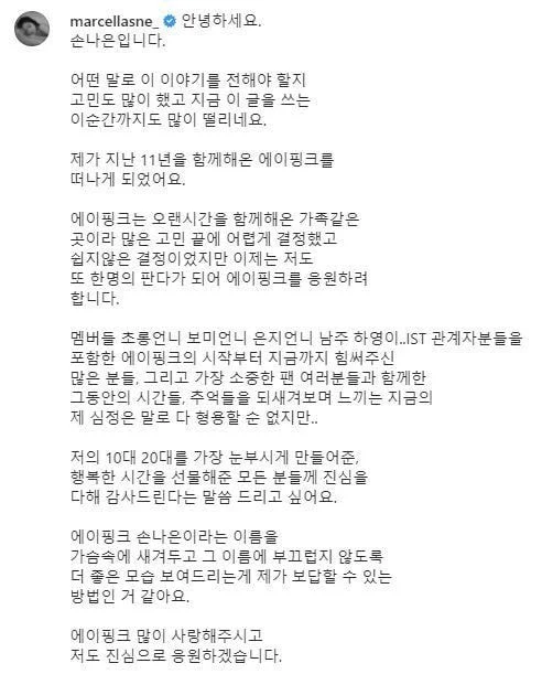 손나은은 8일 자신의 인스타그램에 자필 편지와 함께 "지난 11년을 함께해온 에이핑크를 떠나게 됐다. 쉽지 않은 결정이었지만 이제는 저도 또 한 명의 판다가 되어 에이핑크를 응원하려 한다"는 글을 게재했습니다.
