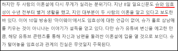 보도에 따르면 둘 사이에 낳은 세 아이를 슈가 홀로 양육 중이라고 설명했는데요. 아울러 임효성의 지인의 말을 빌려 "임효성도 은퇴 이후 사업이 잘 안 풀리는 등 힘겨운 일이 많았다"라고 밝히며 "따로 산 지 꽤 됐고 이혼도 한 것으로 알고 있다"라고 덧붙였습니다.