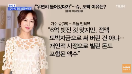 이후 방송가에 두문불출했던 슈는 지난 1월 SNS를 통해 사과문을 공개하고 방송을 통해 근황을 알렸습니다. 슈는 도박으로 인한 빚을 갚기 위해 친언니가 운영하는 체육관에서 일을 돕고, 동대문 시장에서 의류 구매 아르바이트를 하는 등 슈의 일상이 눈길을 끌었습니다.