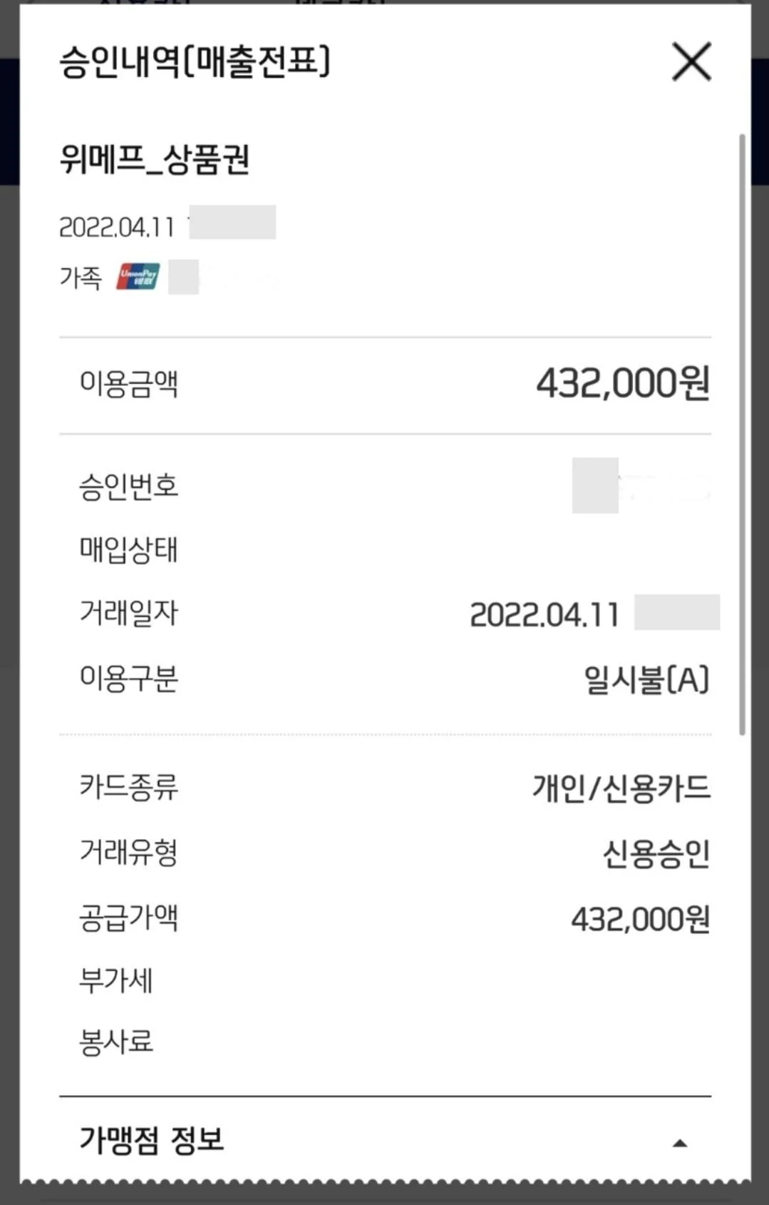 온라인 피해자 커뮤니티 '앱카드 부정사용 피해자 모임'을 통해 피해 사례를 공유한 A씨는 "지난 10일 위메프에서 판매중인 상품권 결제가 앱카드를 통해 이뤄졌다"며 "신용카드 96만원, 체크카드 48만원 등 총 144만원의 피해가 발생했다"고 설명했습니다.
