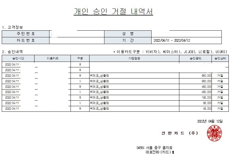 신한카드 앱 개인정보 유출 피해자 B씨는 지난 11일 신한카드 어플을 통해 위메프 상품권을 결제 방식으로 여러번 결제 시도가 이뤄졌으며, 소지한 본인과 남편 명의의 신한카드 3개 중에 남편 명의로 등록된 가족카드에서 카드 승인이 이뤄져 45만 원의 피해를 입었다고 밝혔습니다.