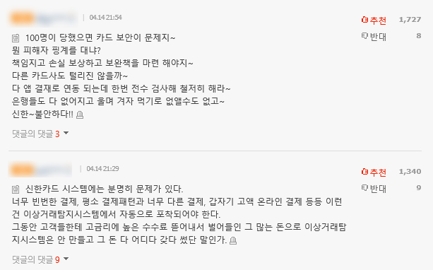 신한카드 해킹 사건을 접한 네티즌들은 "카드 보안이 문제 아니냐", "신한카드 시스템에는 문제가 있다"등의 댓글이 게재되기도 했습니다.