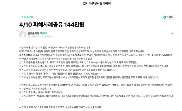 신한카드 앱카드에서 최근 해킹 사고가 발생해 금전적 손해를 입은 사례가 발생, 14일부터 피해자들이 본격적으로 대응에 나섰습니다.