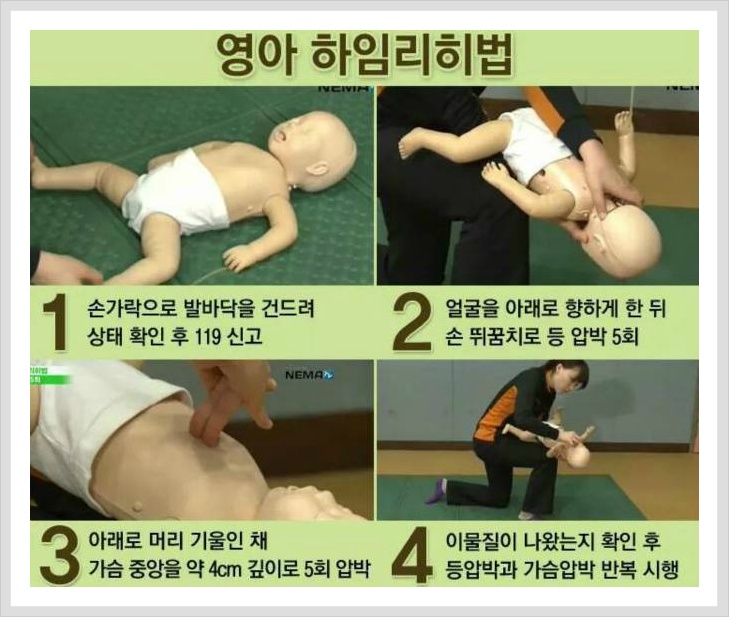 1. 1세 이하의 영아에 실시하는 기도폐쇄 응급처치는 허벅지 위에 아이 머리가 가슴보다 아래를 향하도록 엎드려 놓고 손바닥 밑부분으로 아기 등의 중앙부를 세개 두드립니다.