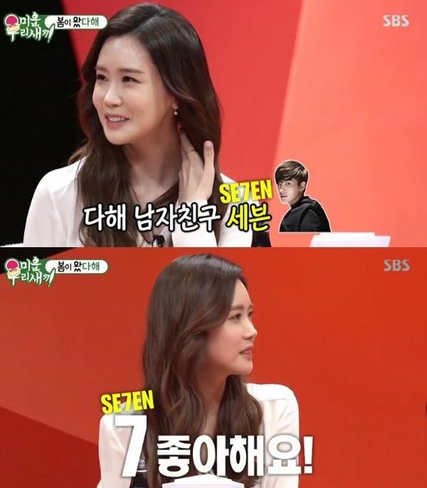 이다해는 '미운우리새끼'에 특별 MC로 출연해 세븐에 대한 마음을 공개하기도 했는데요, 아직 결혼 할 생각이 없다고 말한 이다해에 대해 서장훈은 "좋아하는 숫자가 뭐냐?"고 물었는데 이에 이다해는 웃음을 참지 못하며 "세븐"이라고 대답하기도 했습니다.