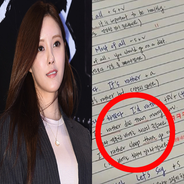 '무엇보다 살을 빼셔야겠다', '상당히 덥다' '나갈 바에는 차라리 잠을 자겠다' 등 여러 영어 문장을 한글로 번역했습니다. 특히 "I'd rather die than marry him"이라는 예문과 "그와 결혼할 바에는 차라리 죽을래요"라는 뜻을 써둔 부분을 찍어 공개해 눈길을 끌었습니다.