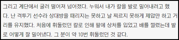 예능프로그램 '강철부대'에 출연한 종합격투기 선수 김상욱이 체육관 앞에서 전 수강생이 휘두른 흉기에 찔려 병원으로 옮겨지는 아찔한 상황을 겪었습니다.