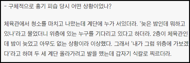 가해자 A씨는 김상욱이 코치로 있는 서울 강남구 신사동 소재의 한 체육관에서 자신의 전 코치였던 김상욱에게 여러 차례 흉기를 휘둘렀습니다. 김상욱은 방어로 제압했지만 팔 7cm가 베이고 0.5cm 깊이로 복부가 찔린 것으로 확인되었습니다.