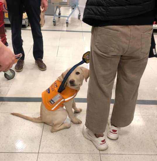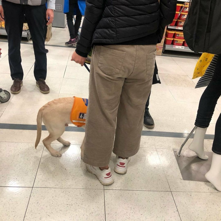 안내견이 롯데마트에 출입했던 이유는 '퍼피워킹' 교육 때문인 것으로 알려졌습니다. 사진 속 강아지는 '안내견 공부 중입니다'라는 장애인 안내견 교육용 주황색 조끼를 입고 있었습니다.