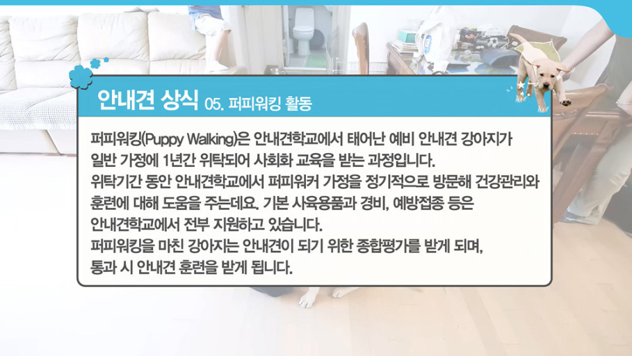퍼피워킹은 한 마리의 안내견이 탄생하기까지 반드시 필요한 과정이며, 이 기간 동안 강아지들은 사람과 더불어 살아가는 에티켓을 배우고 여러 가지 사회 환경에 적응하는 경험을 하게 됩니다. 이때 강아지들이 잘 적응할 수 있도록 도와주는 '퍼피워커'의 역할 역시 매우 중요합니다.