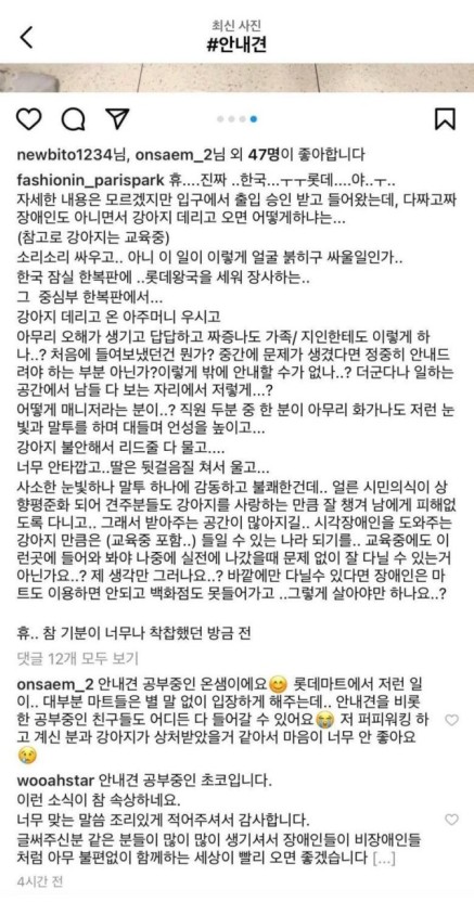 한 인스타그램 이용자는 전날(29일) 자신의 계정에 롯데마트 잠실점에서 매니저로 보이는 직원이 훈련 중인 안내견의 입장을 막고 언성을 높였다는 목격담을 올렸습니다.