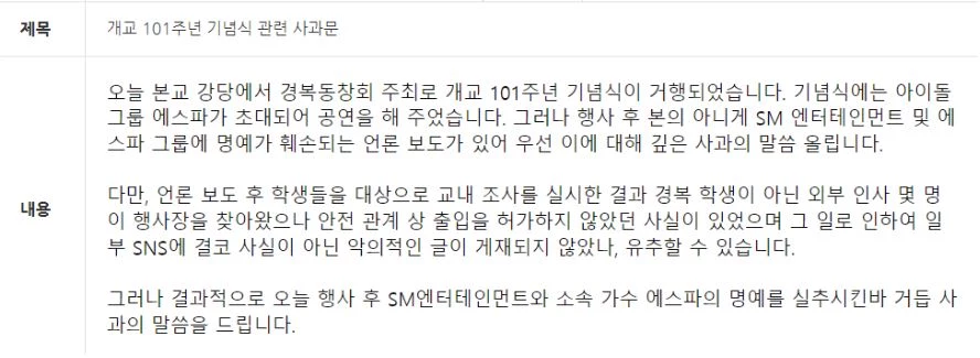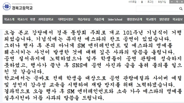 계속해서 경복고에 대한 비판이 쏟아지자 경복고 측은 2차 사과문을 게시했습니다. 경복고는 "전체 학생을 대상으로 공연 관람 예절과 사이버 예절 및 성인지 감수성 교육을 시행하겠다"라고 전했습니다.