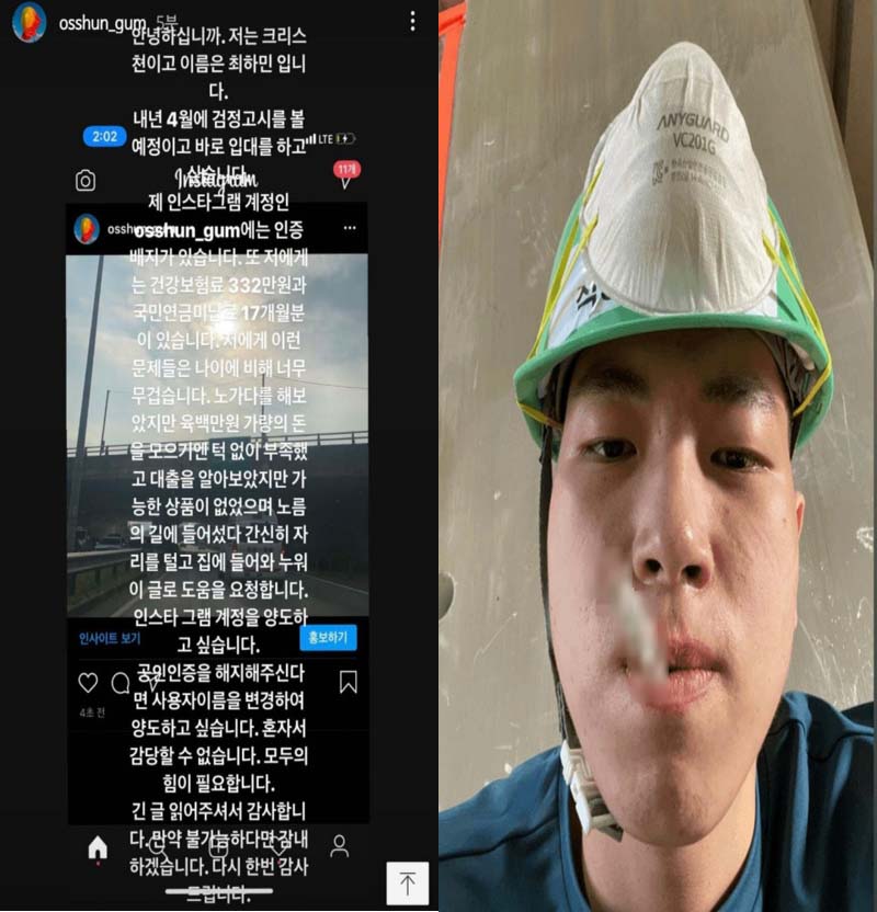 최하민은 이어 "나에게는 건강보험료 332만 원과 국민연금비 17개월분이 있다"며 "이런 문제들은 나이에 비해 너무 무겁다. 노가다를 해보았지만 600만 원가량의 돈을 모으기엔 턱없이 부족했고 대출을 알아보았지만 가능한 상품이 없었으며 노름의 길에 들어섰다 간신히 자리를 털고 집에 들어와 누워 이 글로 도움을 요청한다"고 생활고를 토로해 네티즌들의 관심을 모았습니다.