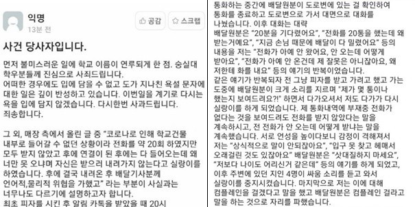 하지만 배달기사에게 사과는 없었고, 오히려 숭실대 학생은 처음 올라온 글과 자신이 겪은 상황을 다르다고 주장했습니다.