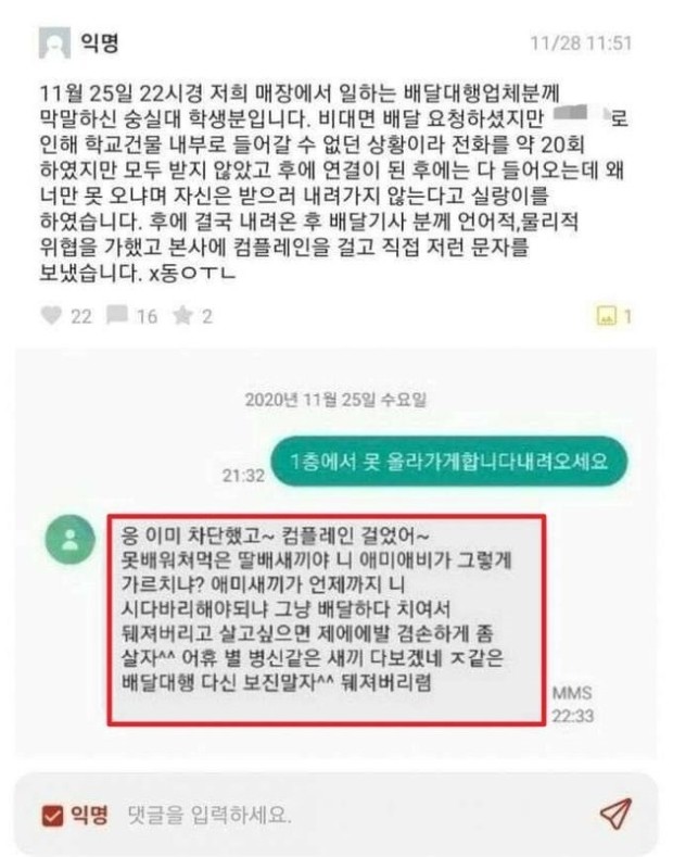 글쓴이는 "25일 오후 10시쯤 저희 매장에서 일하는 배달대행업체 기사분께 막말한 숭실대 학생이다"라며 배달원이 받은 문자 메시지를 공개했습니다.