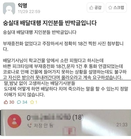 지난 28일 숭실대 재학생 익명 커뮤니티인 에브리타임에는 자신이 일하는 매장의 배달원이 한 대학생 손님에게 폭언을 들었다는 내용의 글이 게시되었습니다.