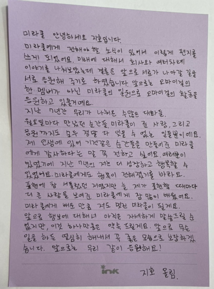 지호는 9일 오마이걸 공식 팬카페에 "많이 놀랐을 우리 크리들에게"라는 제목으로 글과 손편지를 게재했습니다.