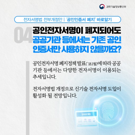 10일부터 공인인증서가 폐지되고 대신 액티브엑스(ActiveX)등의 프로그램을 설치하지 않아도 되는 다양한 방식의 민간 전자서명이 활용됩니다. 전자서명 발급을 위한 신원확인도 비대면 방식으로 가능해지며, 10자리 이상의 복잡한 비밀번호 대신 지문, 안면, 홍채 등의 생체정보나 간편 비밀번호(PIN) 등으로 가입자 인증을 할 수 있게 됩니다.
