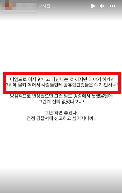 던밀스의 아내는 10일 인스타그램에 "DM으로 여성 만나고 다니는 것까지만 이야기하냐. 그 뒤에 '몰카' 찍어서 사람들에게 공유했던 것은 얘기 안 하냐"라며 "양심적으로 반성했으면 그런 말도 방송에서 못 했을 텐데"라고 지적했습니다.