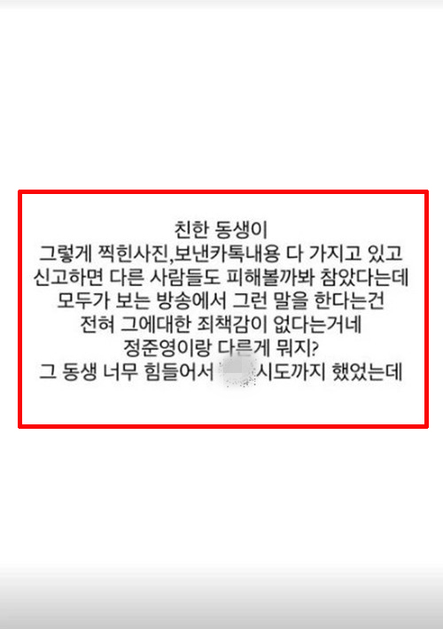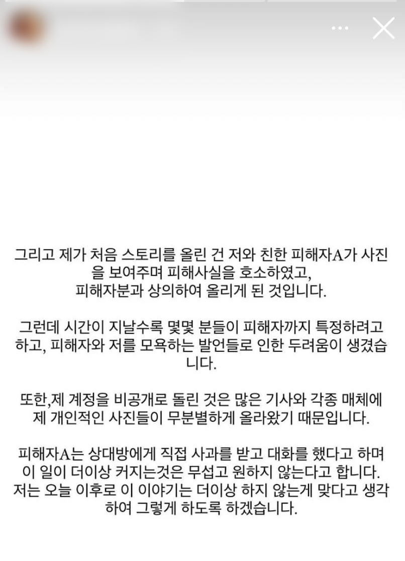 이어 "피해자는 상대방에게 직접 사과를 받고 대화를 했으니 이 일이 더 이상 커지는 것은 무섭고 원하지 않는다고 한다. 저는 오늘 이후로 이 이야기는 더이상 하지 않겠다"고 덧붙였습니다.