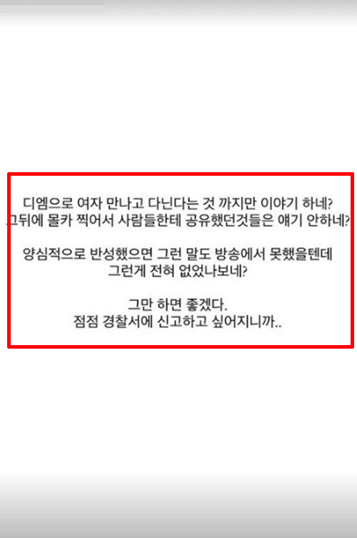 던밀스의 아내는 "DM으로 여자 만나고 다닌다는 것까지만 이야기하네? 몰카 찍어서 사람들한테 공유했던 것들은 얘기 안 하네?"라고 폭로했습니다.