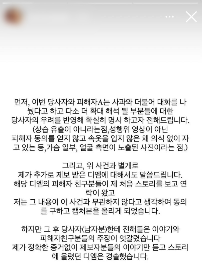 이어 "피해자는 상대방에게 직접 사과를 받고 대화를 했으니 이 일이 더 이상 커지는 것은 무섭고 원하지 않는다고 한다. 저는 오늘 이후로 이 이야기는 더이상 하지 않겠다"고 덧붙였습니다.