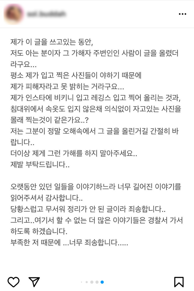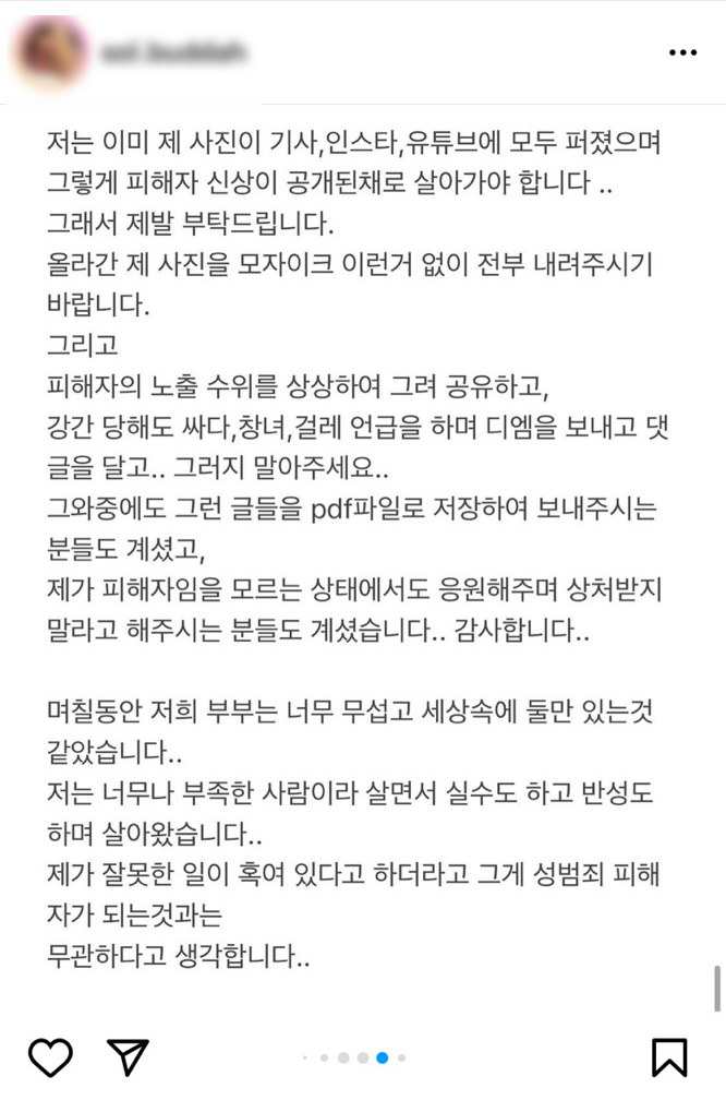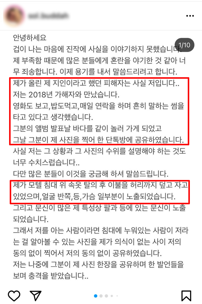 이어 "모텔 침대 위 속옷 탈의 후 이불을 허리까지 덮고 자고 있었으며 얼굴 반쪽, 등, 가슴 일부분이 노출됐다"며 "의식이 없는 사이 뱃사공이 동의 없이 찍어서 동의 없이 공유했다. 공유하며 한 발언들을 보며 충격 받았다"고 밝혔습니다.
