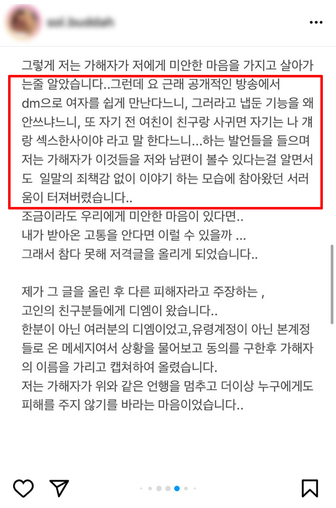앞서 던밀스 아내는 뱃사공이 DM으로 여성들과 만나며 '몰카' 영상을 찍어 주변에 공유하는 사건이 있었다고 폭로했는데요. 당시 던밀스의 아내는 "DM으로 여성 만나고 다닌다는것 까지만 이야기하냐. '몰카' 찍어서 사람들에게 공유했던 것은 얘기 안 하냐. 피해자는 너무 힘들어 극단적 선택 시도도 했다"고 폭로했습니다.