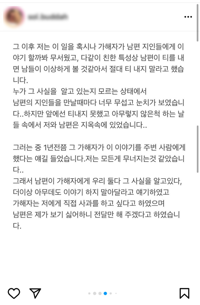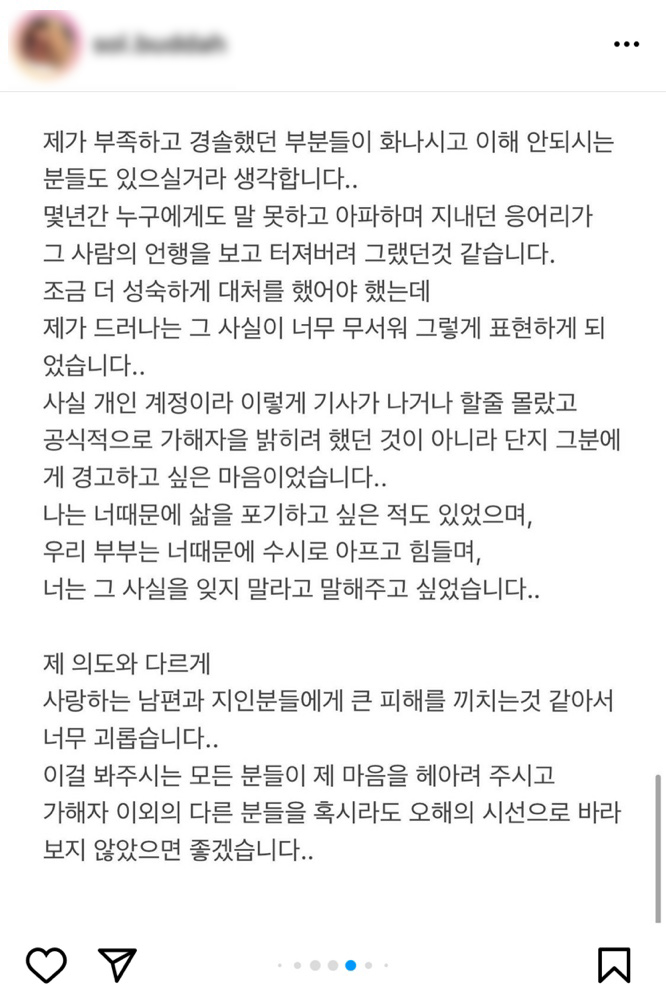 던밀스 아내는 "저는 제가 힘들고 삶을 포기하고 싶을 때, 그런 수치스러운 사진을 보고 나서도 저를 안아주고 저를 사랑해준 제 남편과 항상 저를 따뜻하게 대해주고 아껴준 남편 지인들이 다치는 것을 정말 원하지 않는다"며 "그냥 있었다는 이유로 그 사람들에게 화살을 돌리지 말아 주시길 바란다"고 호소했습니다.