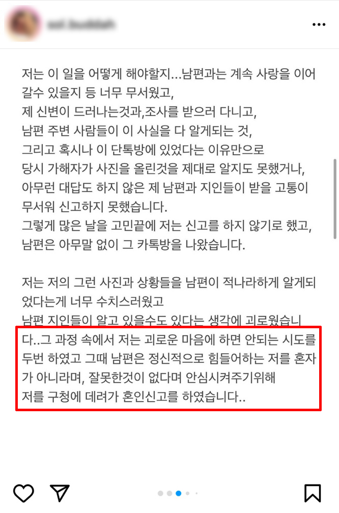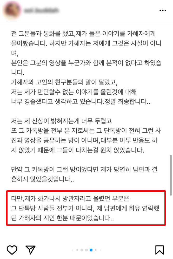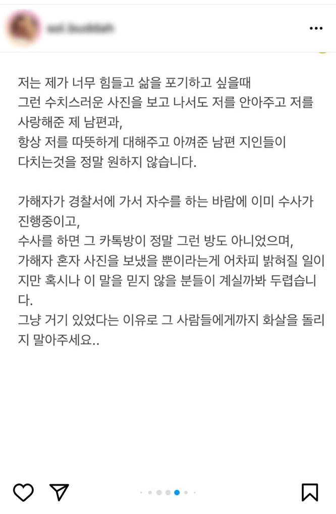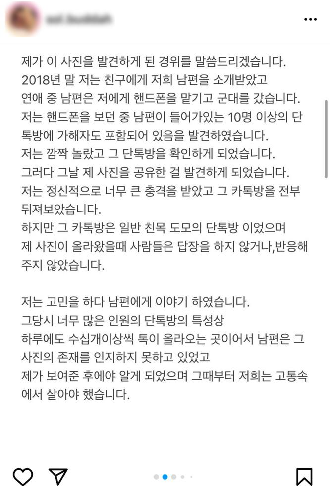 고민 끝에 남편 던밀스에게 이를 알렸고 던밀스는 해당 사진의 존재를 인지하고 못했고 단톡방을 나왔다고 설명했습니다.